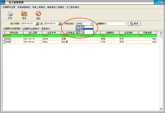 | 在統(tǒng)計報表中可以查詢統(tǒng)計出會員消費情況、營業(yè)情況、衣柜出租情況、會籍顧問的業(yè)績、兌換商品的記錄和會員來訪情況。 | |||