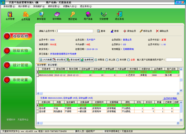 | 收取衣物:接收客戶的預(yù)洗衣物,根據(jù)要求和提示輸入衣物相關(guān)信息。如果是會(huì)員,您可以直接刷卡,并顯示出該會(huì)員的相關(guān)信息(會(huì)員卡余額,消費(fèi)總額,聯(lián)系電話等)。 | |||